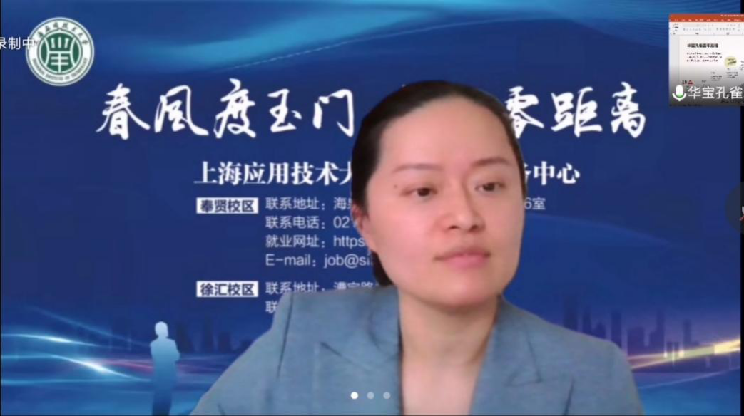 新冠疫情爆發(fā)后給公司的招聘工作帶來(lái)了嚴重阻礙,如何在做好疫情防控的前提下抓好公司儲備人才的選拔培養至關(guān)重要。在華寶孔雀總經(jīng)理李小軍女士的牽頭下,公司綜合管理部積極與上海應用技術(shù)大學(xué)溝通,并聯(lián)合舉辦了一場(chǎng)以“春風(fēng)度玉門(mén),就業(yè)零距離”為主題的空中宣講會(huì ),將公司目前正在招聘的見(jiàn)習調香師等崗位以“直播帶崗”的模式介紹給學(xué)生,同時(shí)對華寶孔雀的公司情況、在招崗位、工作區域等做了詳細的介紹。